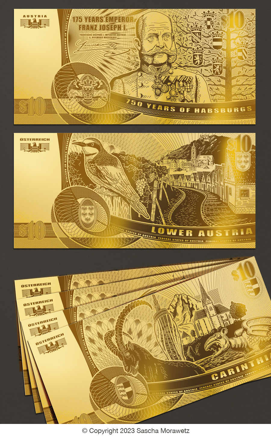 Diesen Projekt startete im Jahr 2022. Ich habe das Layout auf Basis der österreichischen Schilling-Noten entwickelt – natürlich auch mit den typisch feinen Mustern, genannt Guilloché. Im Anschluss habe ich für die 9 österreichischen Bundesländer Illustrationen mit den typischen Landschaften und Sehenswürdigkeiten erstellt. Eine weitere Note ist eine Sonderedition zum Doppel-Jubiläum “175 Jahre Kaiser Franz Joseph I. und 750 Jahre Habsbuger“.
